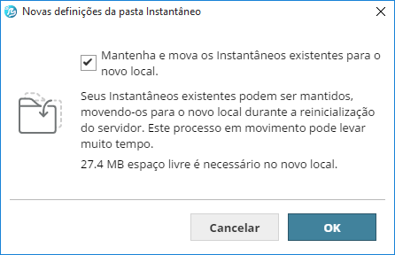 - Marque a opção Manter e Mover os Instantâneos para mover os instantâneos existentes para a nova pasta que você acabou de definir. Se você deixar a caixa desmarcada, todos os instantâneos existentes no local antigo serão apagados.