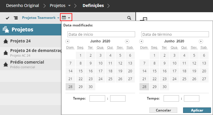 Clique no calendário para definir um período de tempo para filtrar a lista pela data da última modificação.