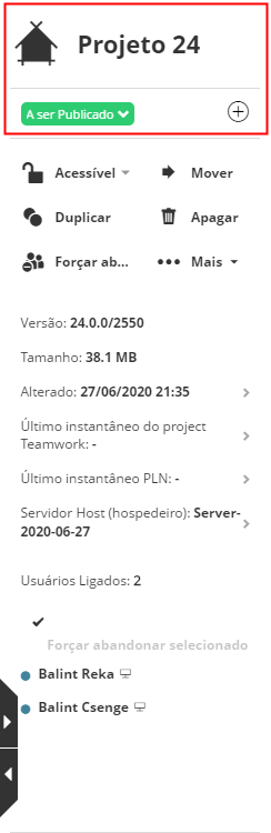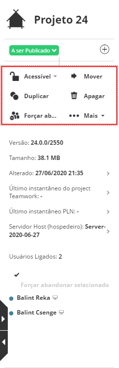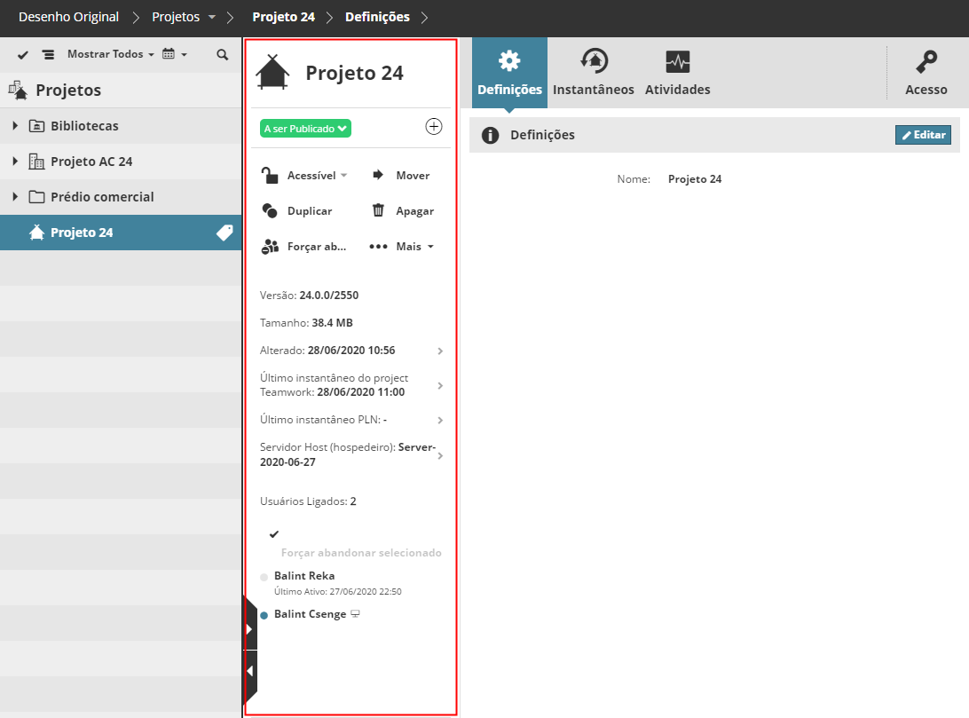 Selecione qualquer item no BIMcloud Manager: a seção de resumo exibe informações rápidas e funções relacionadas.