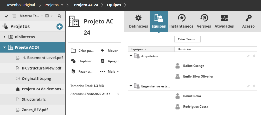 Um Projeto BIMcloud funciona como um tipo especial de pasta. Por exemplo, o seu Projeto BIMcloud pode incluir Projetos Teamwork, arquivos de qualquer formato e subpastas em qualquer hierarquia. Você pode atribuir uma Equipe única de usuários ao seu Projeto BIMcloud e/ou aos seus subitens.