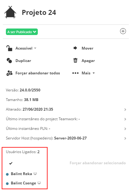 Na página Projetos do BIMcloud Manager, selecione um projeto Teamwork. Os usuários atualmente ingressados são listados. A cor do ponto indica o estado de cada usuário para este projeto: