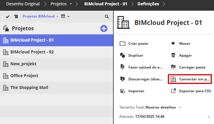 Converter um Projeto BIMcloud em uma pasta significa que suas Equipes e definições de acesso relacionados serão perdidos. (As Equipes são relevantes apenas para Projetos BIMcloud - estes não têm significado em pastas regulares ou outros itens no BIMcloud).