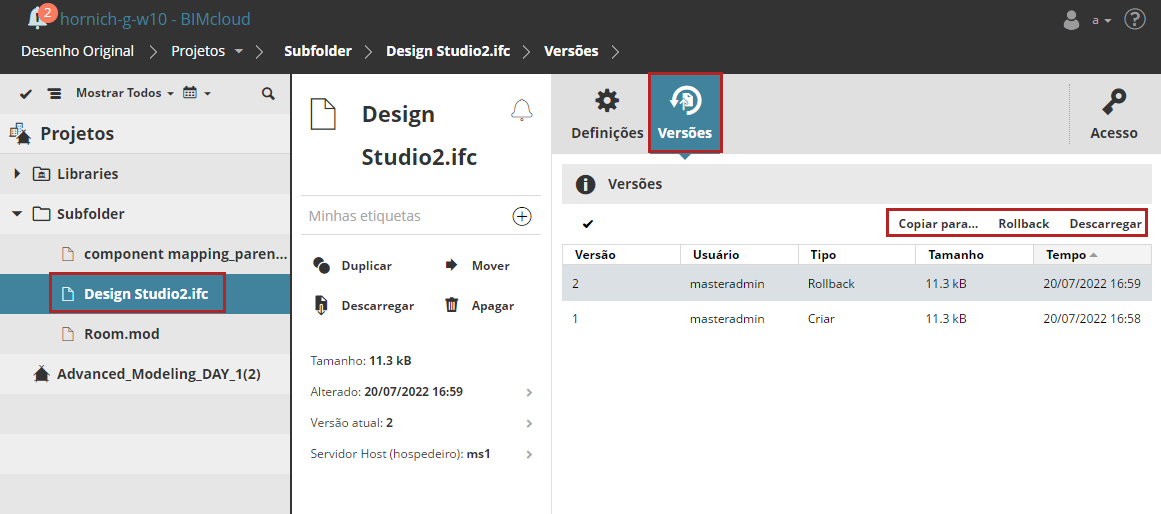 Armazenar e recuperar versões anteriores de arquivos no BIMcloud
