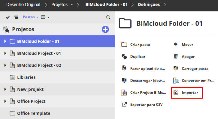 É possível importar um arquivo de Projeto Teamwork (extensão .ProjetoBIM) ou um arquivo de Biblioteca (.BibliotecaBIM) em uma pasta selecionada no BIMcloud.