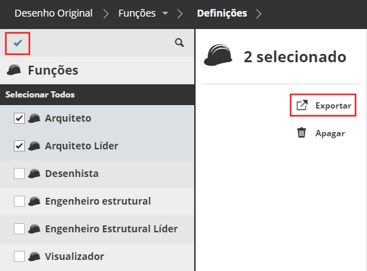 - Selecione a(s) função(ões) que você deseja exportar.Nota: Para selecionar itens múltiplos no Navegador, ative as caixas de seleção clicando na marca de seleção na parte superior da página.
