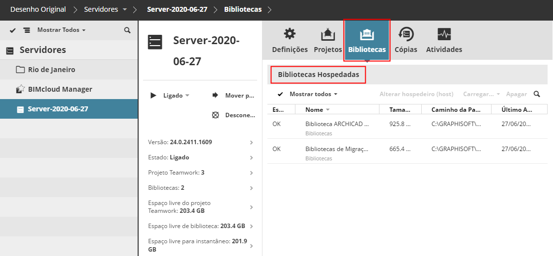 Na página Servidores do BIMcloud Manager, os painéis Projetos e Bibliotecas estão disponíveis para um BIMcloud Server ou pasta selecionada.