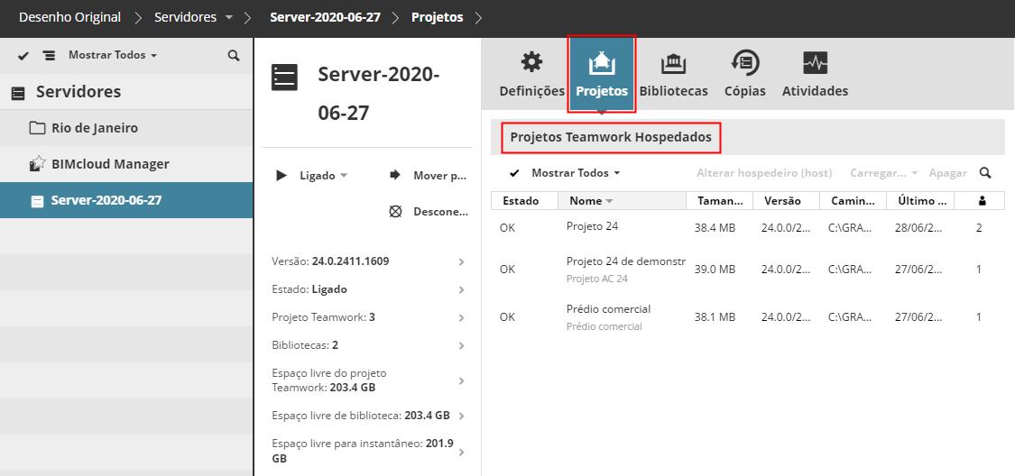 O BIMcloud Manager e o BIMcloud Server são componentes separados. Um projeto/biblioteca listado no BIMcloud Manager deve ter um projeto vinculado ou dados de biblioteca disponíveis no Server também. O inverso também é verdadeiro: os dados hospedados no Server devem ser ligados a uma entidade do projeto/biblioteca no BIMcloud Manager.