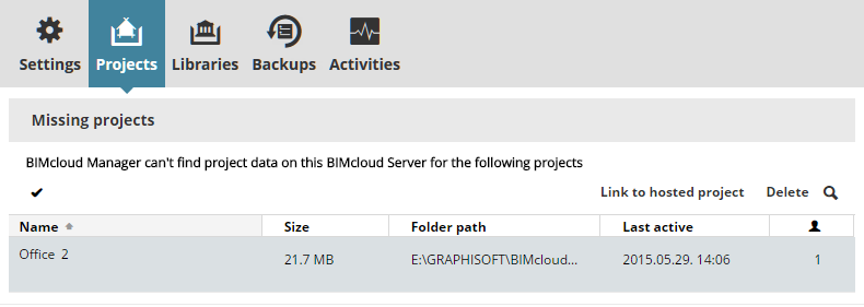 Se o BIMcloud Manager se refere a um projeto/uma biblioteca em um servidor, mas o projeto/biblioteca não está mais lá, então este é listado na seção de projetos Em Falta ou bibliotecas Em Falta.
