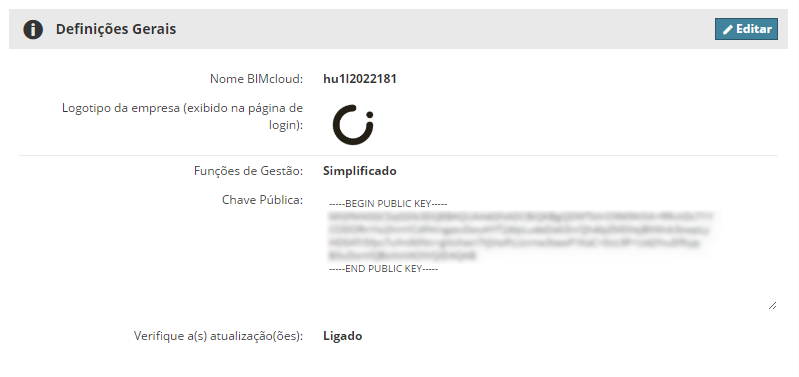 Chave Pública: A chave pública do BIMcloud Manager. A chave pública não pode ser modificada.