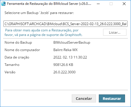 Nota: O local de Backup foi definido por você quando você configurou o BIMcloud Server ou Manager. Consulte Onde estão os arquivos de backup do servidor?Clique em Restaurar.