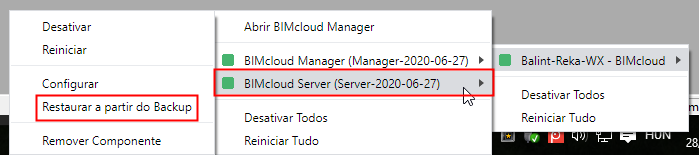 Clique no nome do componente cujos dados você deseja restaurar: BIMcloud Server ou BIMcloud Manager.