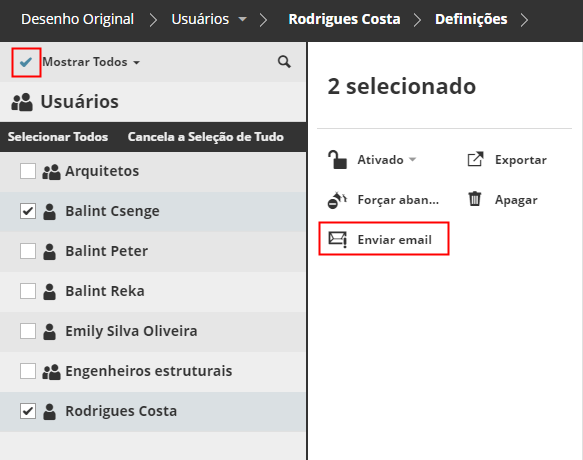 Enviar um e-mail aos usuários selecionados do BIMcloud