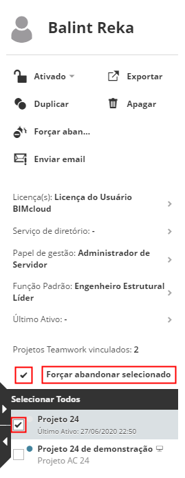 Nota: Abandonar à Força um usuário é algo imediato; o usuário não será capaz de enviar suas alterações. Um usuário Abandonado à Força pode ser religado ao projeto imediatamente, sem mais restrições. Se você quiser impedir que o usuário religue-se ao projeto, revogue suas permissões no painel de acesso do projeto.