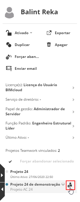 Na lista projetos Teamwork Vinculados ao usuário, passe o mouse sobre o nome de um projeto para exibir o ícone Abandonar à Força.