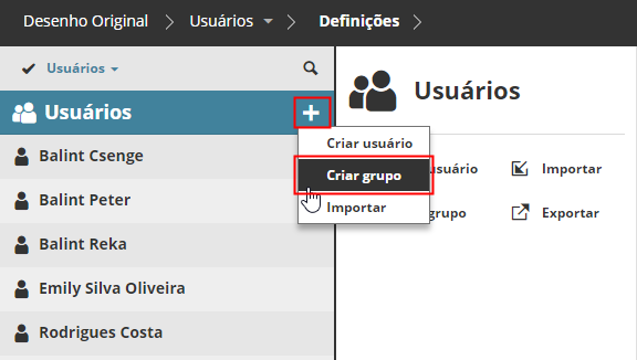Clique no sinal + do pop-up e escolha Criar Grupo. (Se a raiz dos Usuários e grupos for selecionada, você também pode escolher o comando a partir do painel Resumo).