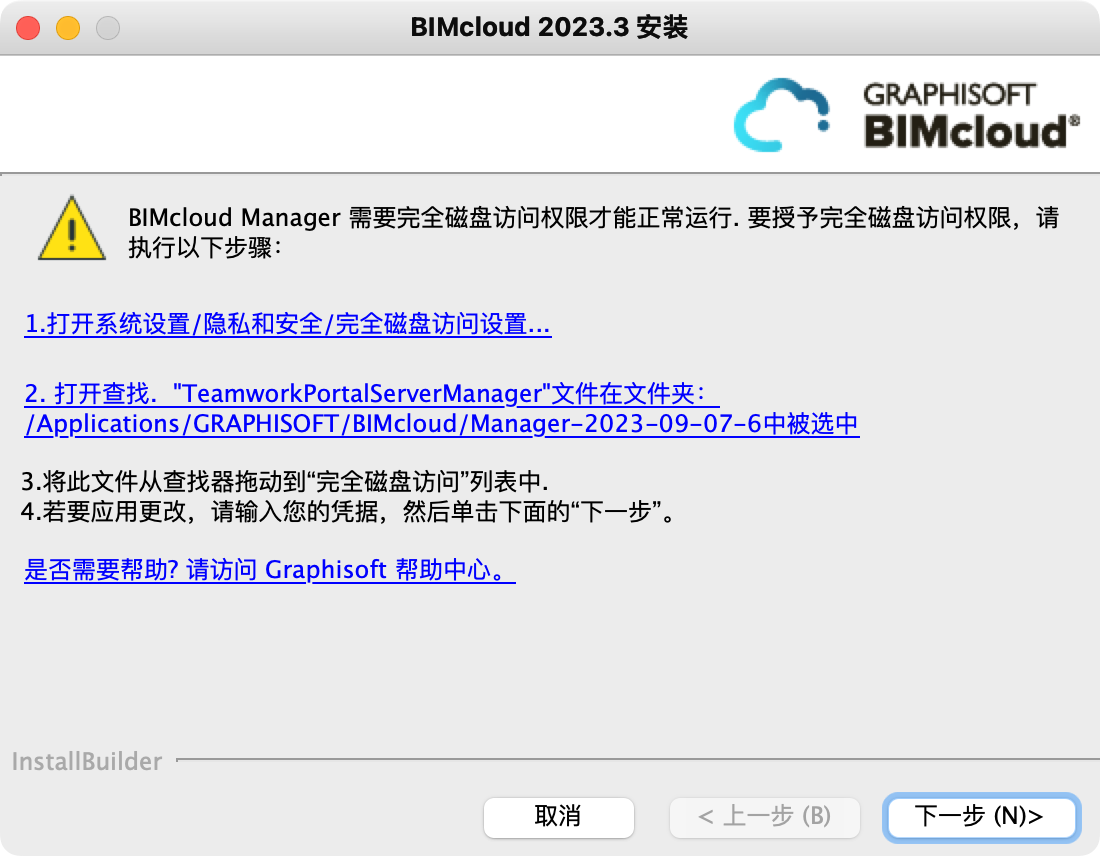 在 Mac 上安装或更新 BIMcloud 组件后,会弹出一个额外的对话框:要让 BIMcloud 正常运行,必须先在 macOS 设置中启用全磁盘访问。