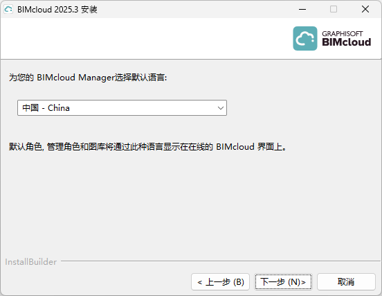 - 选择一种默认语言。此语言已应用于BIMcloud Manager内的浏览器基础界面。如有需要,稍后您可以在BIMcloud Manager内对语言进行转换。