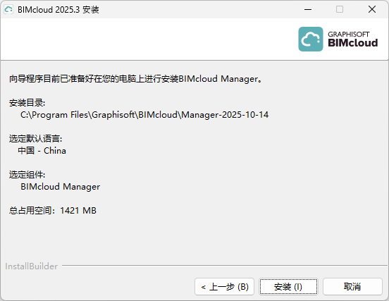 - 总结面板上会显示您目前安装的BIMcloud Manager位置。单击 安装 开始。