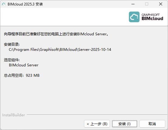 - 总结面板上会显示您目前安装的BIMcloud Server位置。点击 安装开始