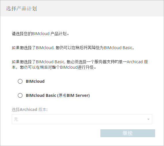 - 选择产品计划 - 完全版BIMcloud, 或BIMcloud Basic