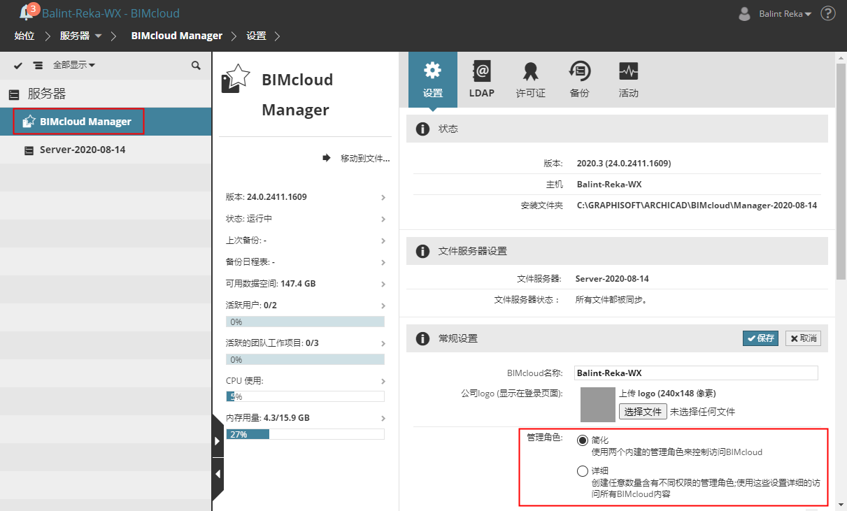 BIMcloud提供了两种在BIMcloud上实现管理角色的方法:简化和精细。