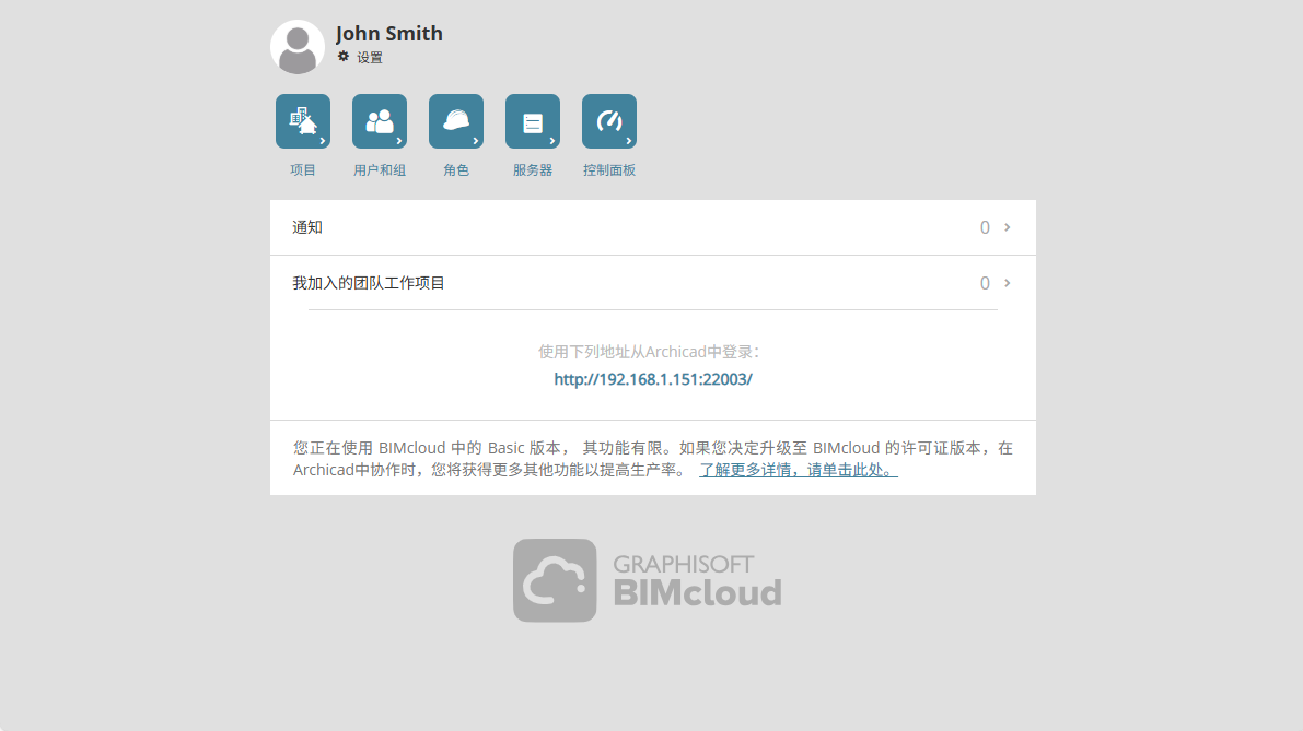 您 可以 在任何一台可以通过网络访问BIMcloud的电脑上打开 该 BIMcloud Manager 网页界面。执行下列任意操作: