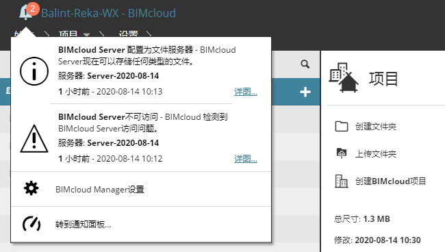 标头包含有关BIMcloud的通知以及BIMclouds设置的快捷方式。