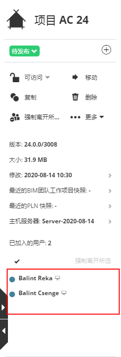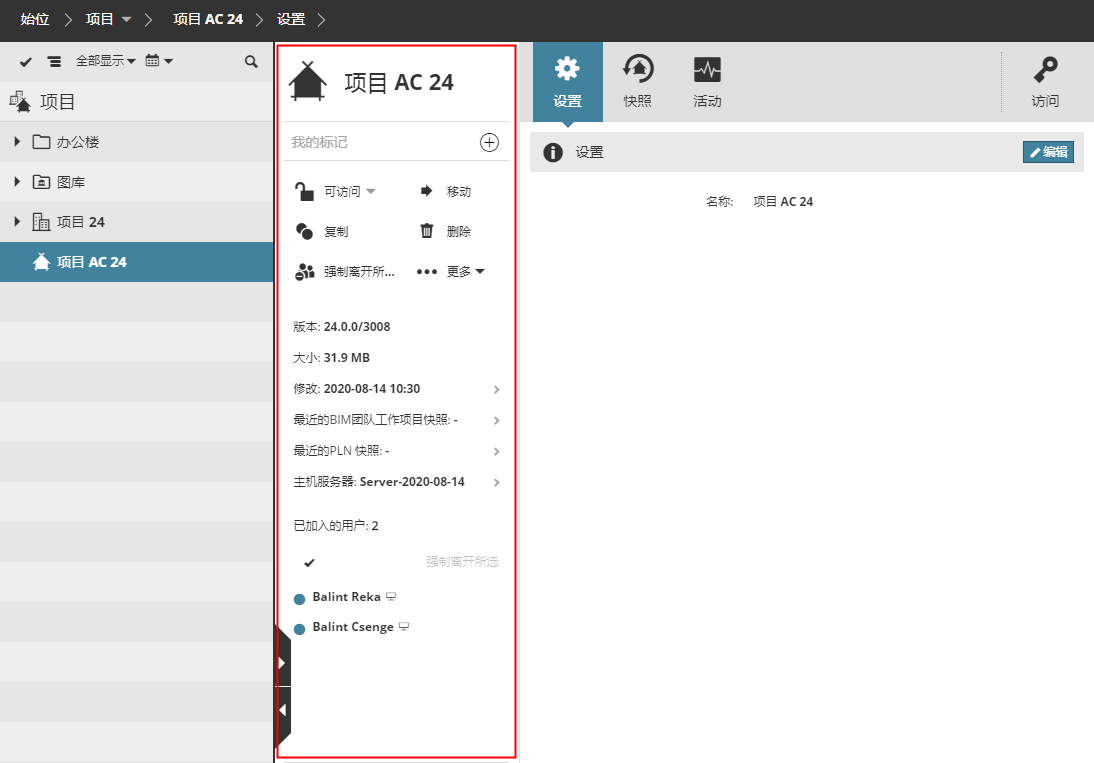 在BIMcloud Manager中选择任何项目:摘要部分显示快捷信息和相关功能。