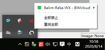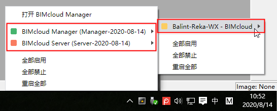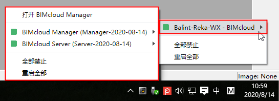 单击托盘图标访问已安装的BIMcloud组件和相关命令。BIMcloud按名称区分(BIMcloud名称显示在BIMcloudManager-常规设置中。)