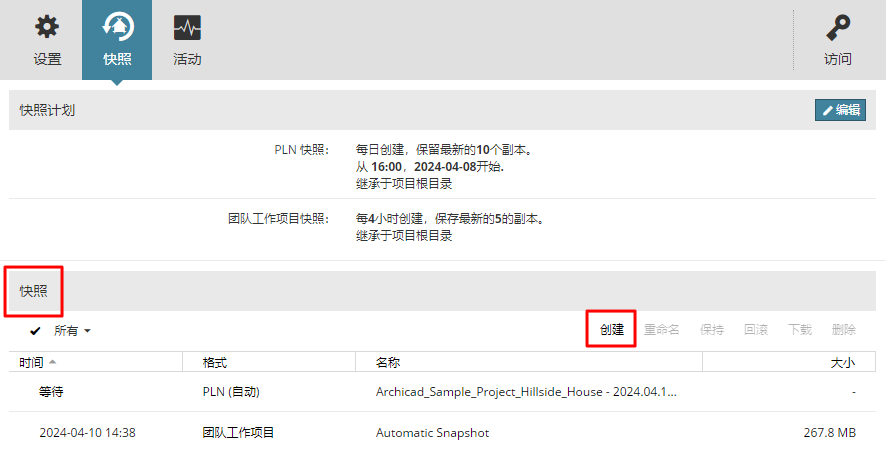 - 在项目根目录中,选择需要创建快照的团队合作项目或图库。