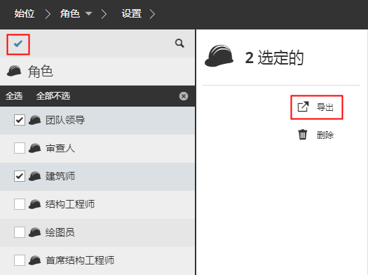 导出角色 使用此功能将角色转移到不同的 BIMcloud,或作为备份 选择您想要导出的角色。注: 要在浏览器中多选项目,单击页面顶部的确认符号激活复选框。 点击 导出。 所有要被导出的用户数据将被放置在一个单独的文件夹中,并被下载到浏览器的默认下载文件夹中,其扩展名是.bimroles。 父主题: 管理 BIMcloud 角色