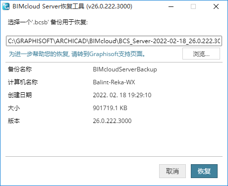 也恢复服务器设置(建议):默认情况下,应选中并建议选中此选项。即,您将不仅仅恢复团队工作项目和图库,也会恢复原是安装的BIMcloud Server/Manager的端口设置、加密锁及配置信息。
