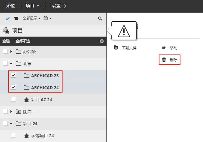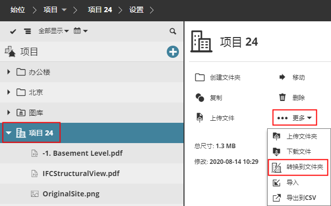 如果您的项目页面包含任何BIMcloud项目,您必须将其转换为文件夹。内容将保留在文件夹中,但BIMcloud项目的团队定义将被删除。