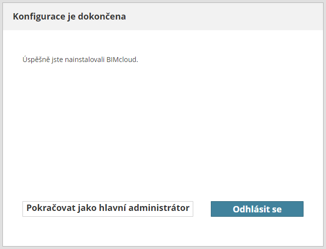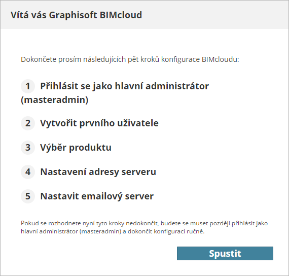 Otevře se okno prohlížeče, ve kterém se zobrazí dalších 5 kroků potřebných k dokončení nastavení BIMcloudu. (Pokud se prohlížeč neotevře automaticky, použijte adresu URL : http://localhost:PORT, kde PORT odpovídá číslu portu, které jste zadali na stránce konfigurace.)