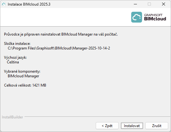 - Na panelu přehledu bude nyní zobrazena složka, kam bude BIMcloud Manager nainstalován. Spusťte instalační proces tlačítkem Instalovat.