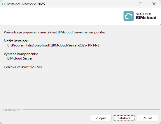 - Na panelu přehledu bude nyní zobrazena složka, kam bude BIMcloud Server nainstalován. Instalaci spusťte tlačítkem Instalovat.