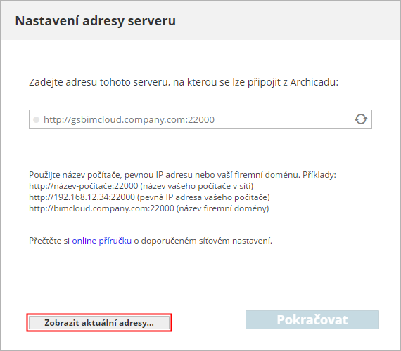 - Tuto adresu můžete později změnit v BIMcloud Manageru na panelu nastavení.