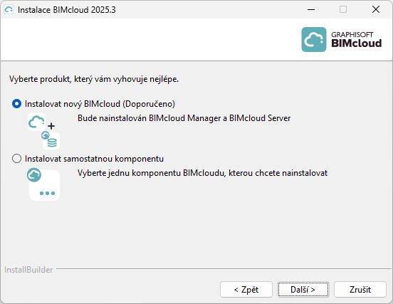 - Vyberte volbu Instalovat nový BIMcloud. Nyní nainstalujete a nakonfigurujete dvě komponenty, jednu po druhé:
