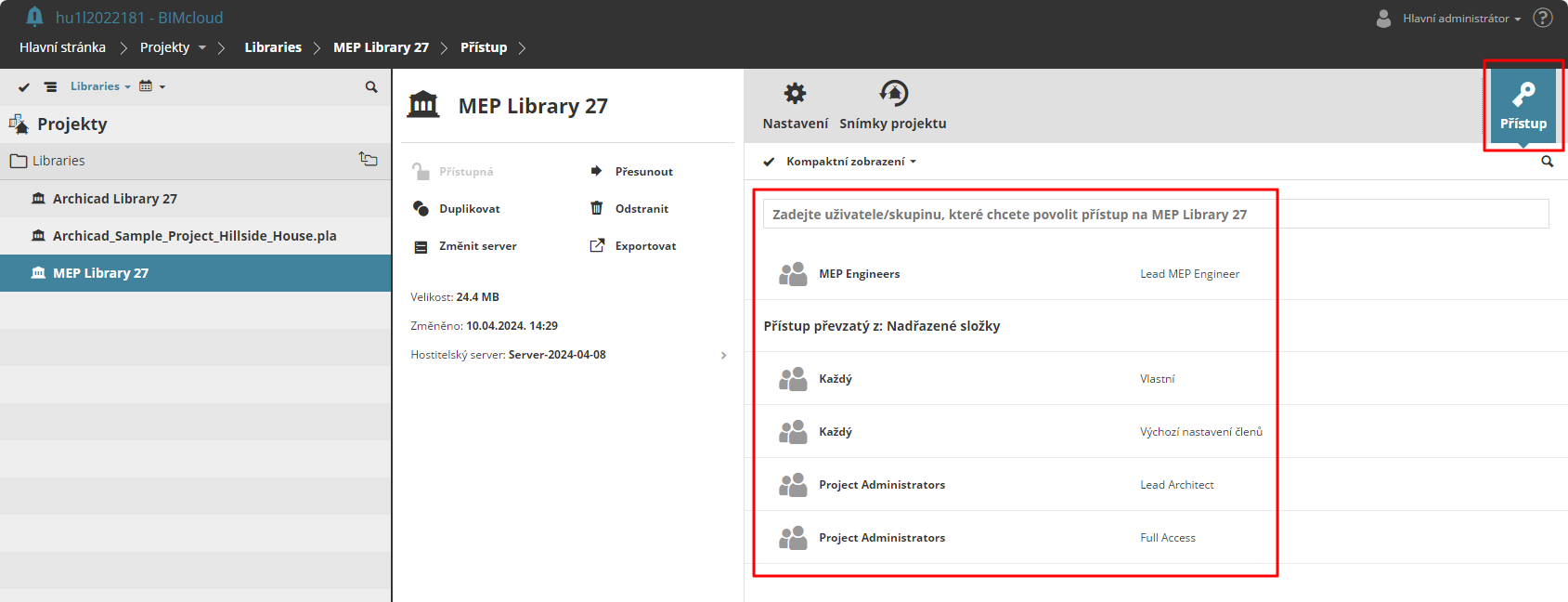 Vyberte položku ve BIMcloud Manageru. Na panelu Přístup jsou zobrazení uživatelé a skupiny, které mají k položce přístup.