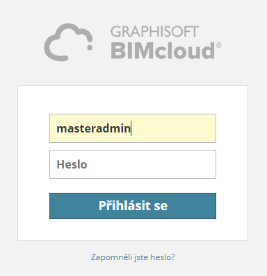 Přihlašovací jméno hlavního administrátora je: masteradmin. Heslo je nastaveno při instalaci serveru v procesu konfigurace BIMcloud Manageru. Pokud jste heslo zapomněli, spusťte znovu konfiguraci BIMcloud Manageru a nastavte nové heslo.