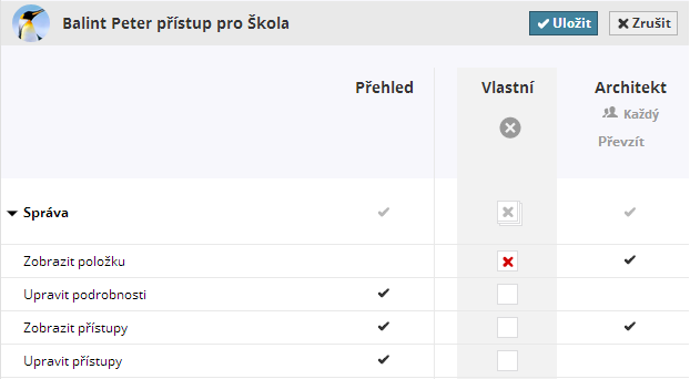 Nicméně pokud bylo uživateli přiděleno přístupové právo jako členovi skupiny, není možné odebrat přístupová práva konkrétního uživatele.