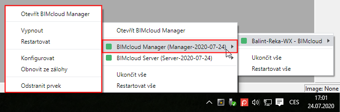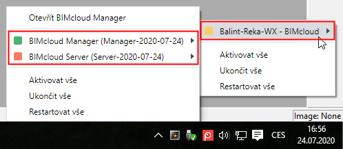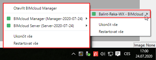 Pomocí aplikace v oznamovací oblasti můžete kontrolovat a ovládat stav nainstalovaných komponent BIMcloudu. Aplikace se nainstaluje a automaticky spouští na serverovém počítači.