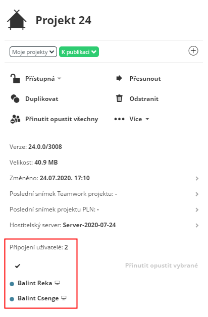 Na stránce Projekty v BIMcloud Manageru vyberte Teamwork projekt: V seznamu jsou uvedeni aktuálně připojení uživatelé. Barva tečky u jména uživatele ukazuje jeho stav v projektu: