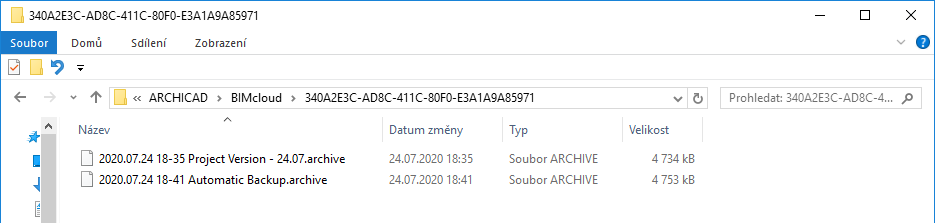 Soubory snímků (snímky Teamwork projektů a PLN snímky) jsou obojí ukládány do složky Projekty > [ID projektu] > Zálohy ve složce instalace BIMcloud Serveru s příponou .archive.