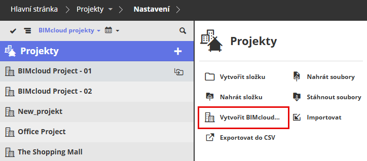 V BIMcloud Manageru otevřete stránku Projekty.