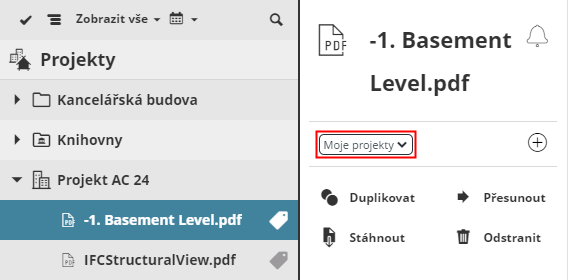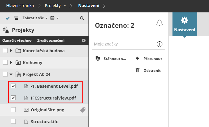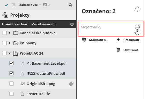 Značky můžete přidávat ke všem položkám na stránce projektů v BIMcloudu: Teamwork projektům, BIMcloud projektům, knihovnám, složkám a nahraným souborům.