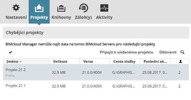 Pokud BIMcloud Manager odkazuje na projekty/knihovny na serveru, ale projekty/knihovny již na místě nejsou, budou vypsány sekcích Chybějící projekty nebo Chybějící knihovny.
