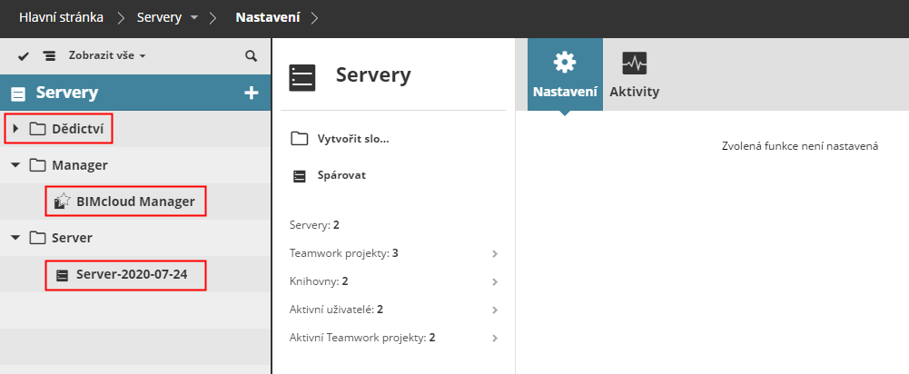 Zobrazení a úprava nastavení serverů v BIMcloud Manageru