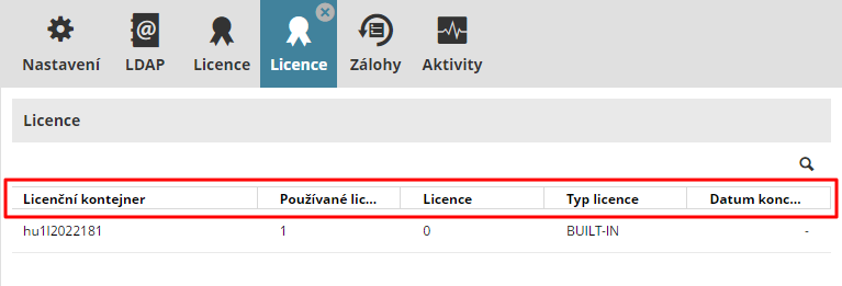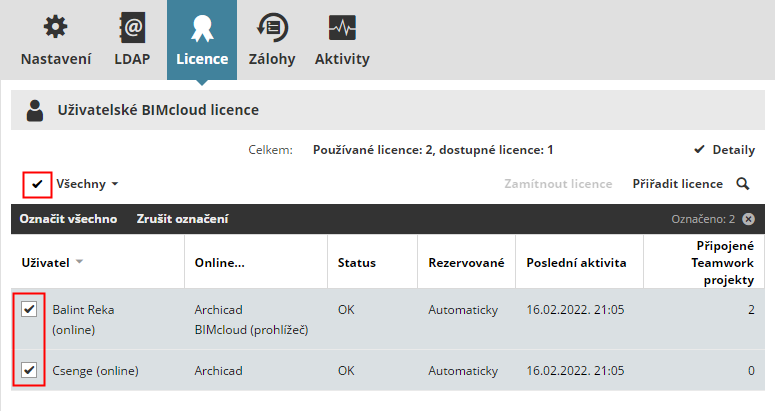Licenci uživatele můžete také přiřadit nebo zrušit v Nastavení uživatele (stránka Uživatelé).
