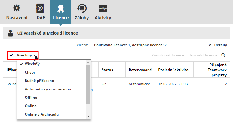 Zde je přehled o všech aktuálně používaných, dostupných a chybějících BIMcloud uživatelských licencích.